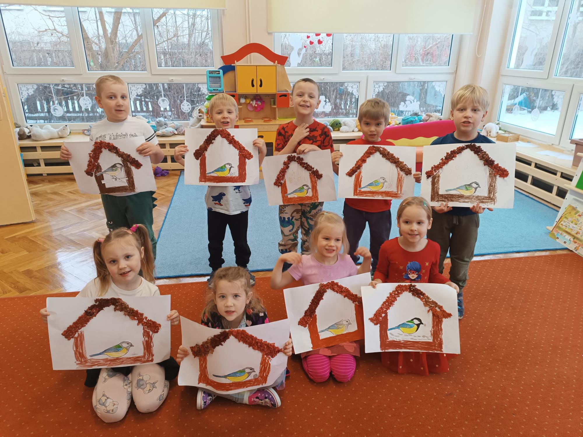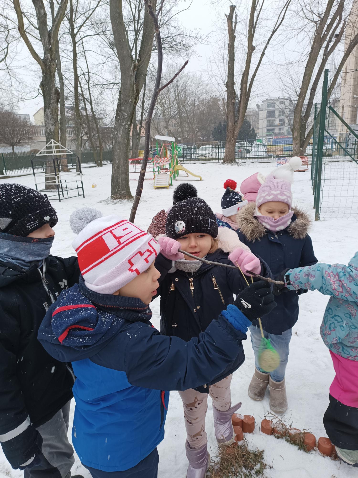 Dzieci poznały sposoby dokarmiania ptaków zimą oraz dowiedziały się, dlaczego pomoc ptakom w tym okresie jest tak ważna. Wspólnie zawiesiły w ogrodzie przedszkolnym pokarm dla ptaków, ucząc się troski o przyrodę. Na zakończenie zajęć wykonały pracę plastyczną – karmnik, rozwijając swoją kreatywność i sprawność manualną.