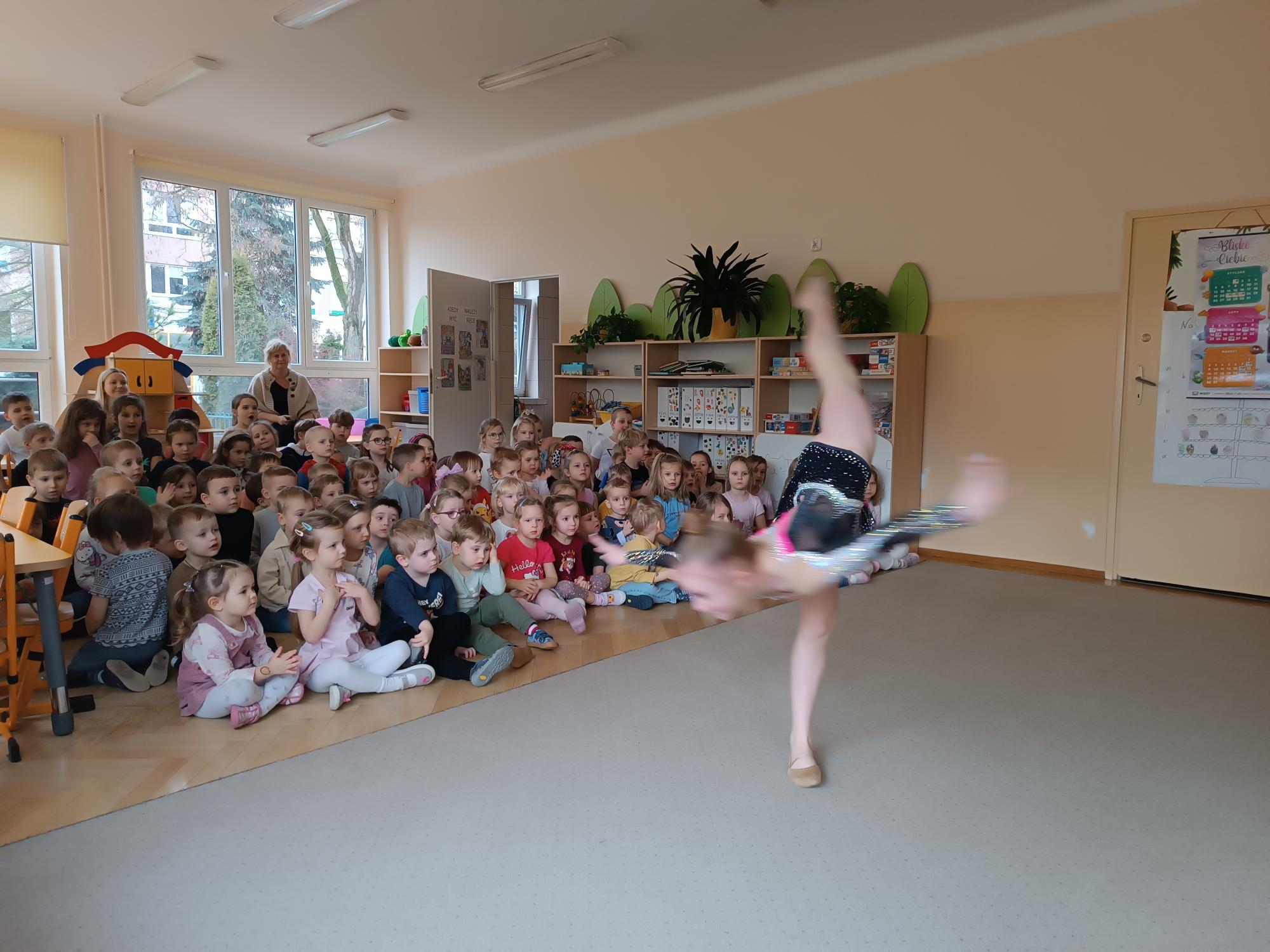 Nasze przedszkole miało wyjątkowych gości. Odwiedziły nas reprezentantki Szkoły Podstawowej nr 41, które zaprezentowały swoje wspaniałe układy gimnastyki artystycznej. Dziewczynki zachwyciły wszystkich swoimi umiejętnościami, gracją oraz pięknie przygotowanymi choreografiami. Dzieci z ogromnym zainteresowaniem oglądały występ i nagrodziły artystki gromkimi brawami. To było niezwykle inspirujące i radosne spotkanie.