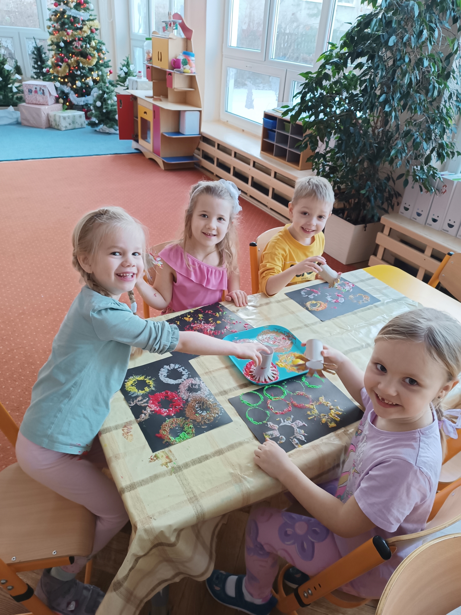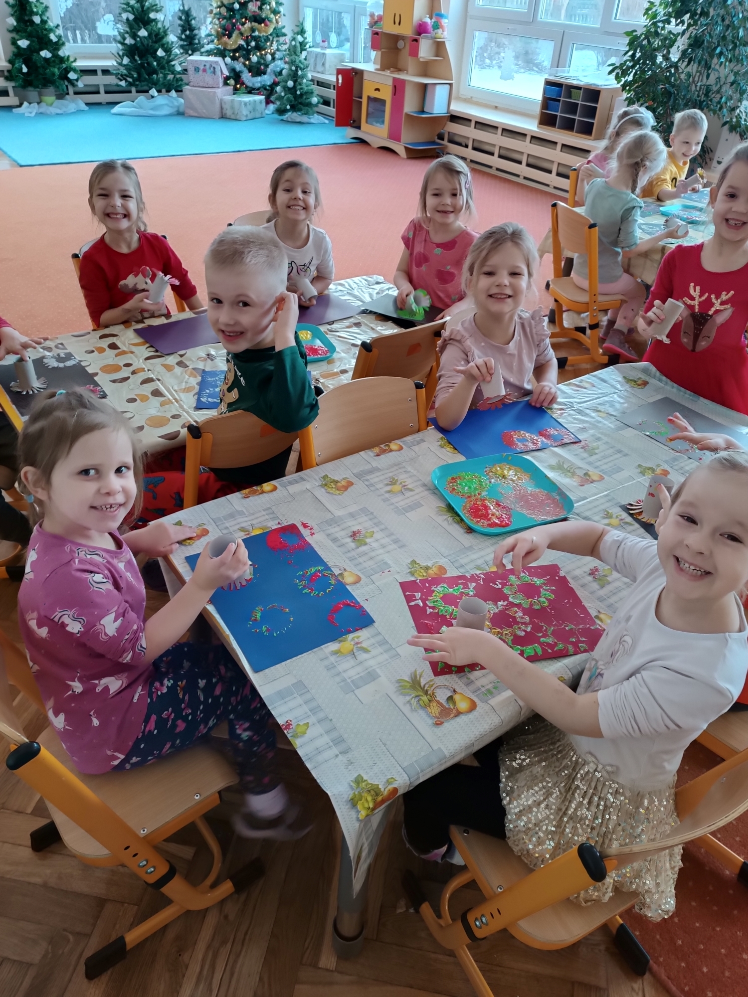 W minionych dniach dzieci uczestniczyły w zajęciach poświęconych tematyce Sylwestra. Rozmawialiśmy o zmianie czasu oraz o tym, jak witamy Nowy Rok. Dzieci chętnie dzieliły się swoimi spostrzeżeniami związanymi z tym wydarzeniem. W ramach zajęć plastycznych wykonały prace malarskie przedstawiające sylwestrowe fajerwerki.