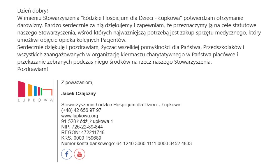 Otrzymaliśmy podziękowanie od Hospicjum wraz z informacją, że zebrane środki zostaną przeznaczone na zakup sprzętu medycznego, dzięki któremu możliwe będzie objęcie opieką kolejnych małych pacjentów.