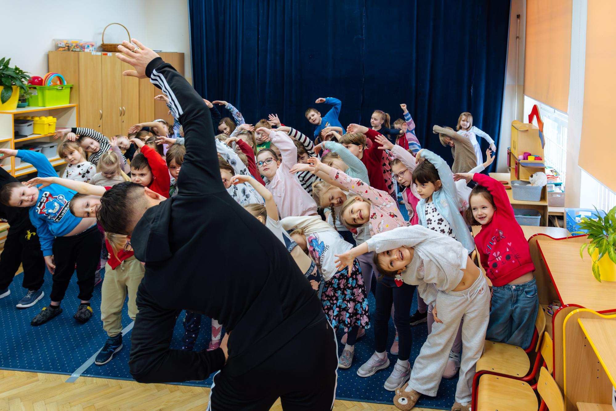 Nie zabrakło części praktycznej! Zawodnicy pokazali przedszkolakom, jak prawidłowo wykonać rozgrzewkę przed aktywnością fizyczną. Dzieci z ogromnym zaangażowaniem ćwiczyły razem z nimi, ucząc się, że przygotowanie do wysiłku jest bardzo ważne dla zdrowia i bezpieczeństwa.