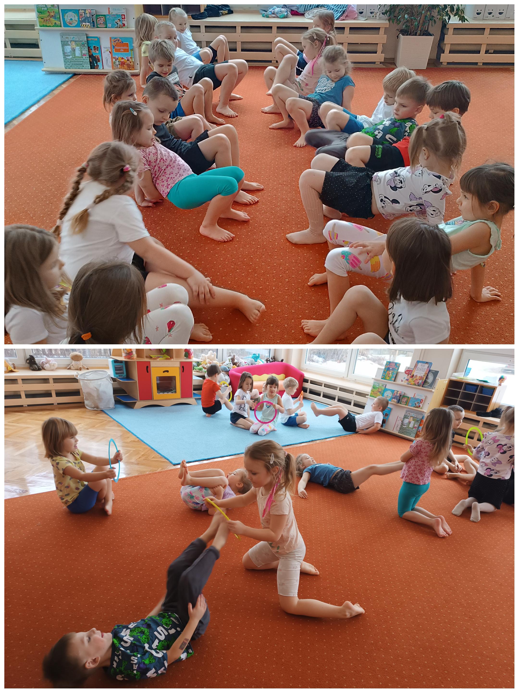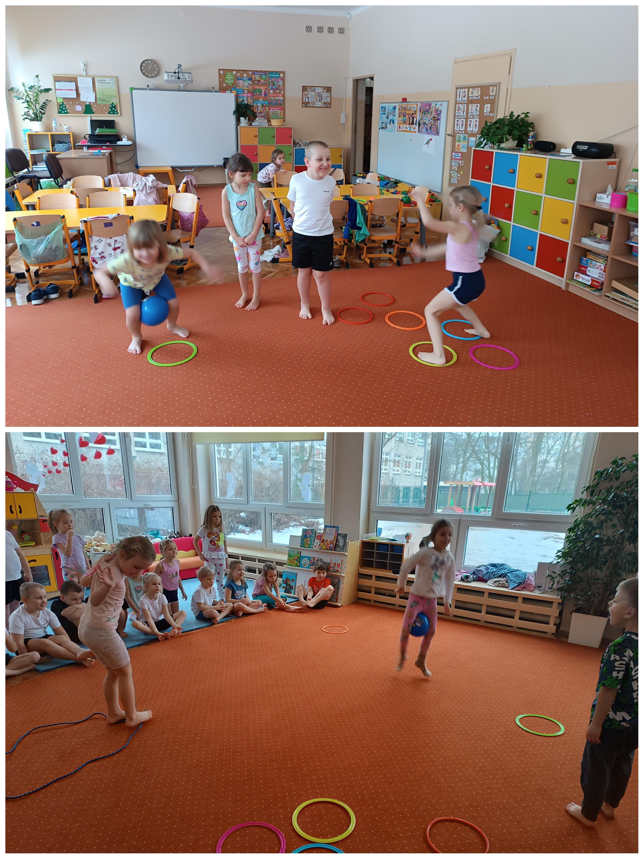Podczas zajęć dzieci aktywnie ćwiczyły swoją sprawność ruchową poprzez różnorodne zabawy i ćwiczenia. Wspólne działania sprzyjały rozwijaniu umiejętności współpracy, wzajemnej pomocy oraz komunikacji w grupie.