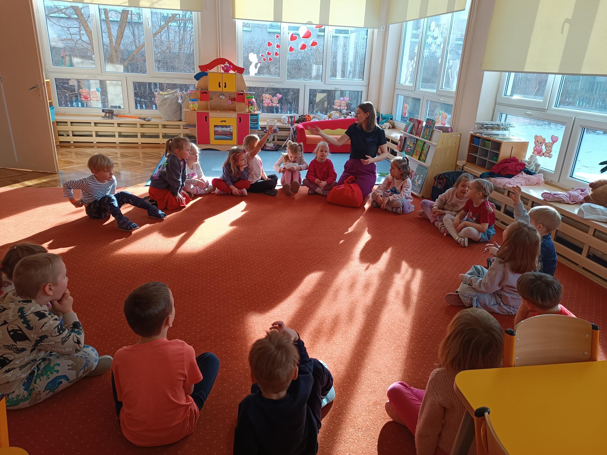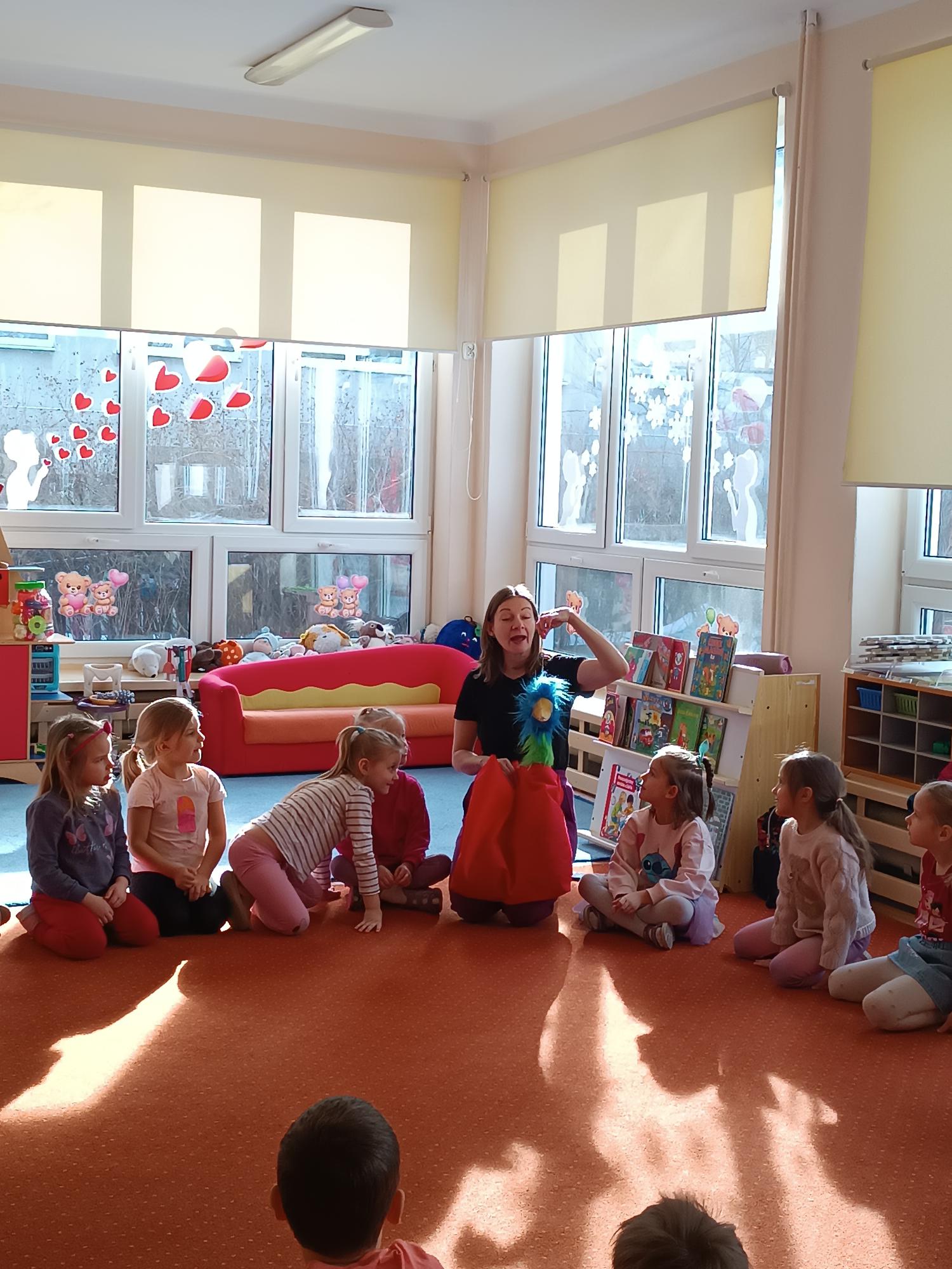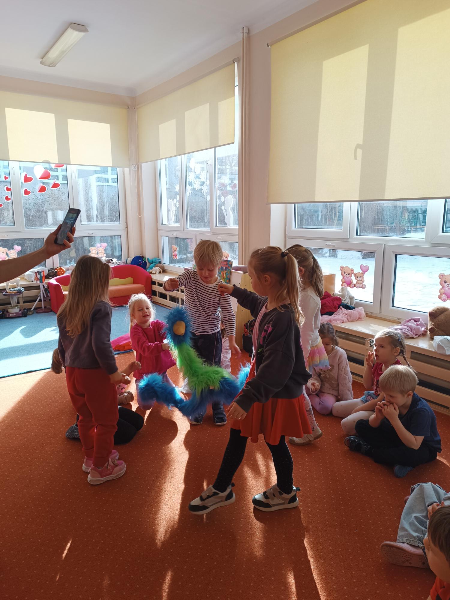 Podczas ostatnich warsztatów dzieci miały okazję poznać, czym jest marionetka oraz w jaki sposób się nią porusza. Dowiedziały się, że to szczególny rodzaj lalki teatralnej, którą animuje się za pomocą sznurków lub nitek. Z zainteresowaniem obserwowały jej ruchy i odkrywały, jak ożywa w rękach animatora. Nie zabrakło również zabaw słownych. Dzieci tworzyły własne rymy, bawiąc się dźwiękiem i brzmieniem słów. Powstało wiele pomysłowych i zabawnych połączeń, które wywołały dużo radości i śmiechu. To były twórcze zajęcia rozwijające wyobraźnię, kreatywność oraz wrażliwość językową.