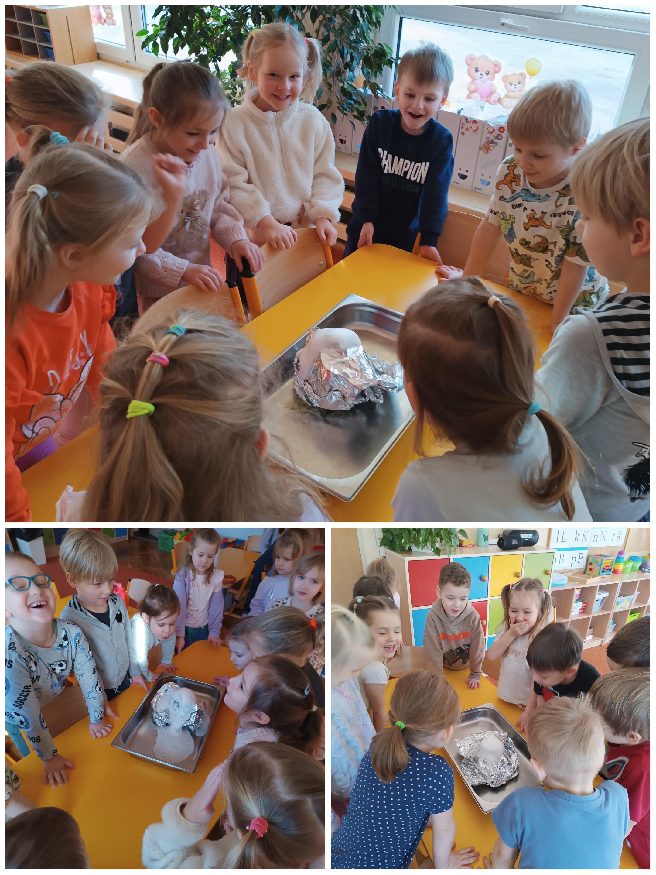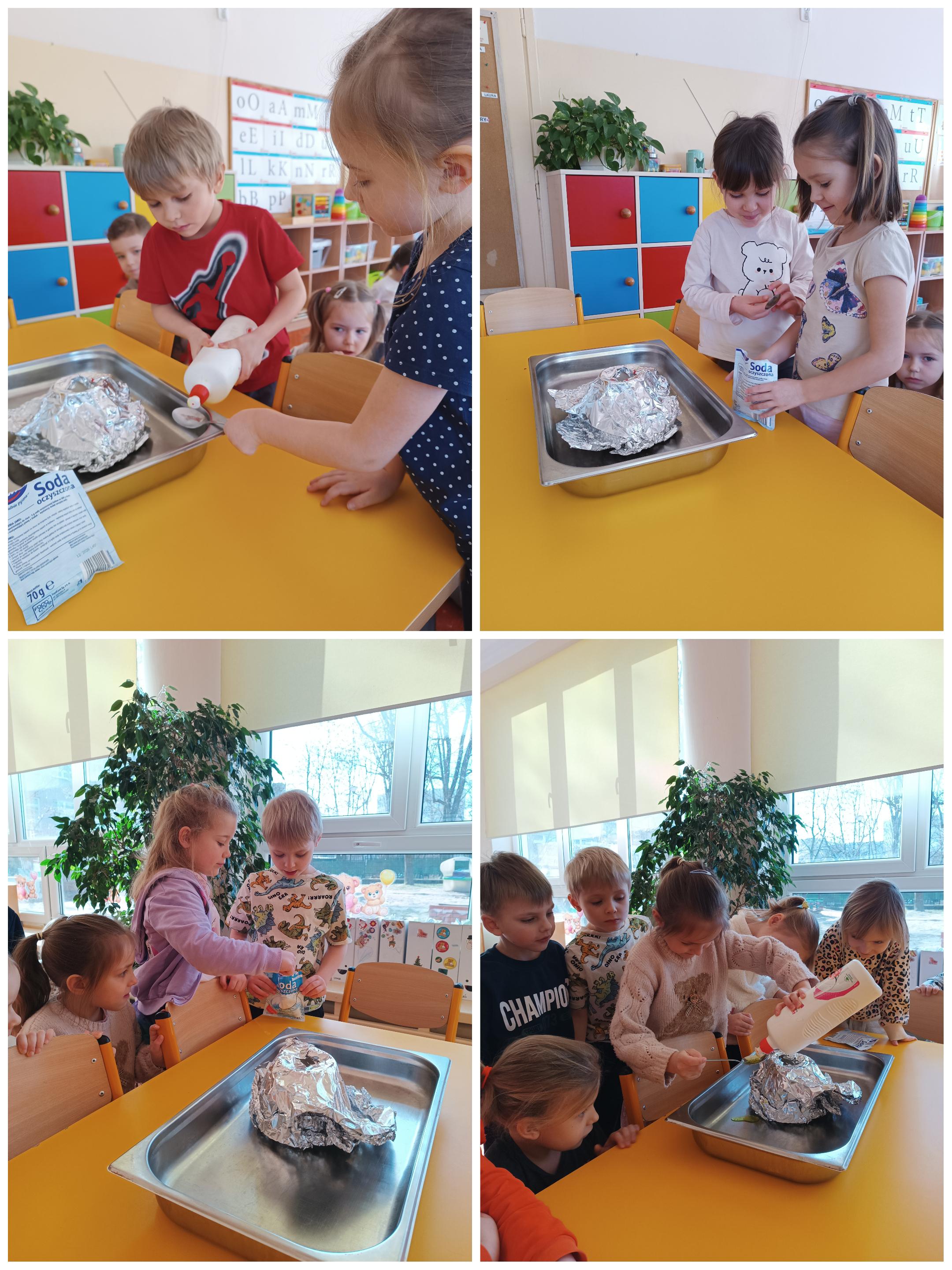 Przez cały tydzień rozmawiamy o dinozaurach, poznajemy ciekawostki z ich życia i odkrywamy, jak wyglądał świat miliony lat temu. Dziś natomiast poruszyliśmy temat wulkanów! Dzieci pracowały w dwóch grupach – musiały ze sobą współpracować, podzielić się zadaniami i wspólnie przeprowadzić doświadczenie przedstawiające erupcję wulkanu. Było dużo emocji, świetnej zabawy i nauki przez działanie!
