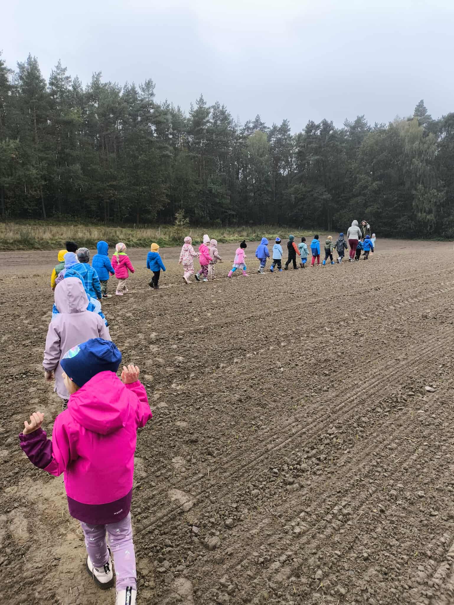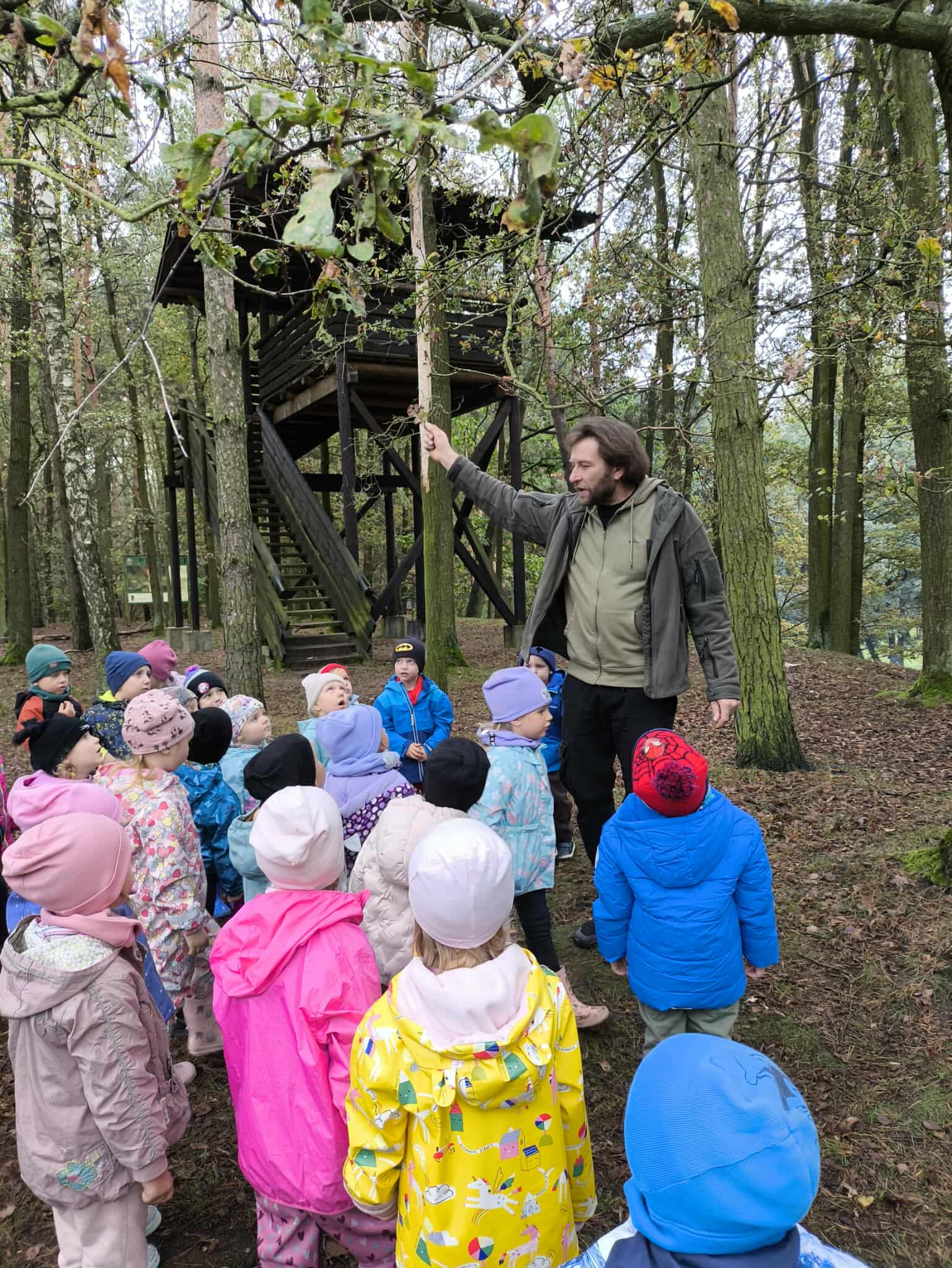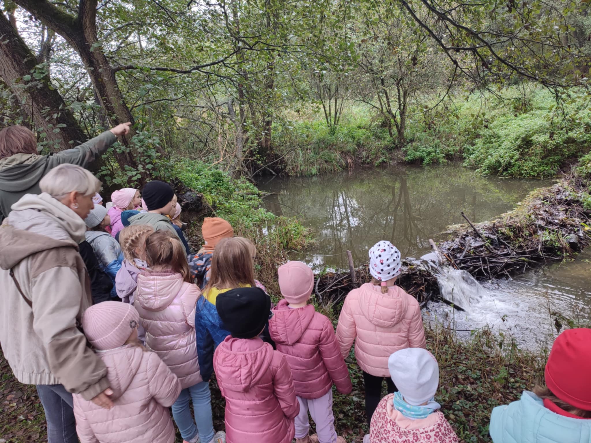 Przedszkolaki spacerowały po drewnianym mostku nad rzeką, oglądały domki na drzewach, a w czasie wolnym z radością bawiły się na placu zabaw i wędrowały po polu. Wielkie zainteresowanie wzbudziła również tama bobrów na rzece, którą dzieci mogły obejrzeć z bliska.