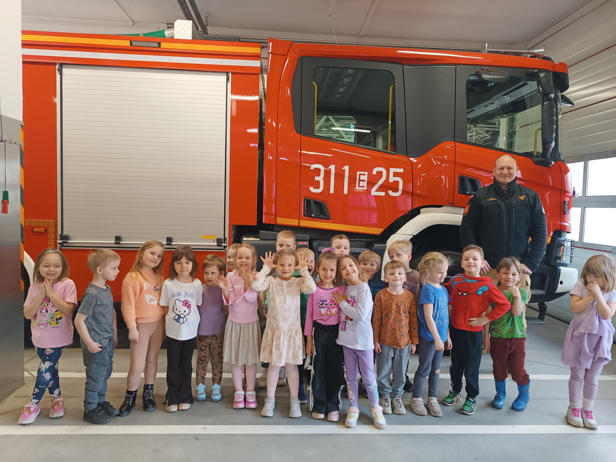Dzieci uczestniczyły w pieszej wycieczce do Jednostki Ratowniczo-Gaśniczej Nr 11 Komendy Miejskiej Państwowej Straży Pożarnej w Łodzi. Podczas wizyty miały okazję poznać dyżurkę, usłyszeć dźwięk syren alarmowych oraz z bliska obejrzeć wszystkie wozy strażackie. Dowiedziały się również, na czym polega codzienna praca strażaka i jak ważna jest jego rola w zapewnianiu bezpieczeństwa. Na zakończenie spotkania dzieci, w ramach podziękowania, wręczyły strażakom własnoręcznie wykonane, grupowe laurki, wyrażając w ten sposób swoją wdzięczność za ciepłe przyjęcie i ciekawe zajęcia.