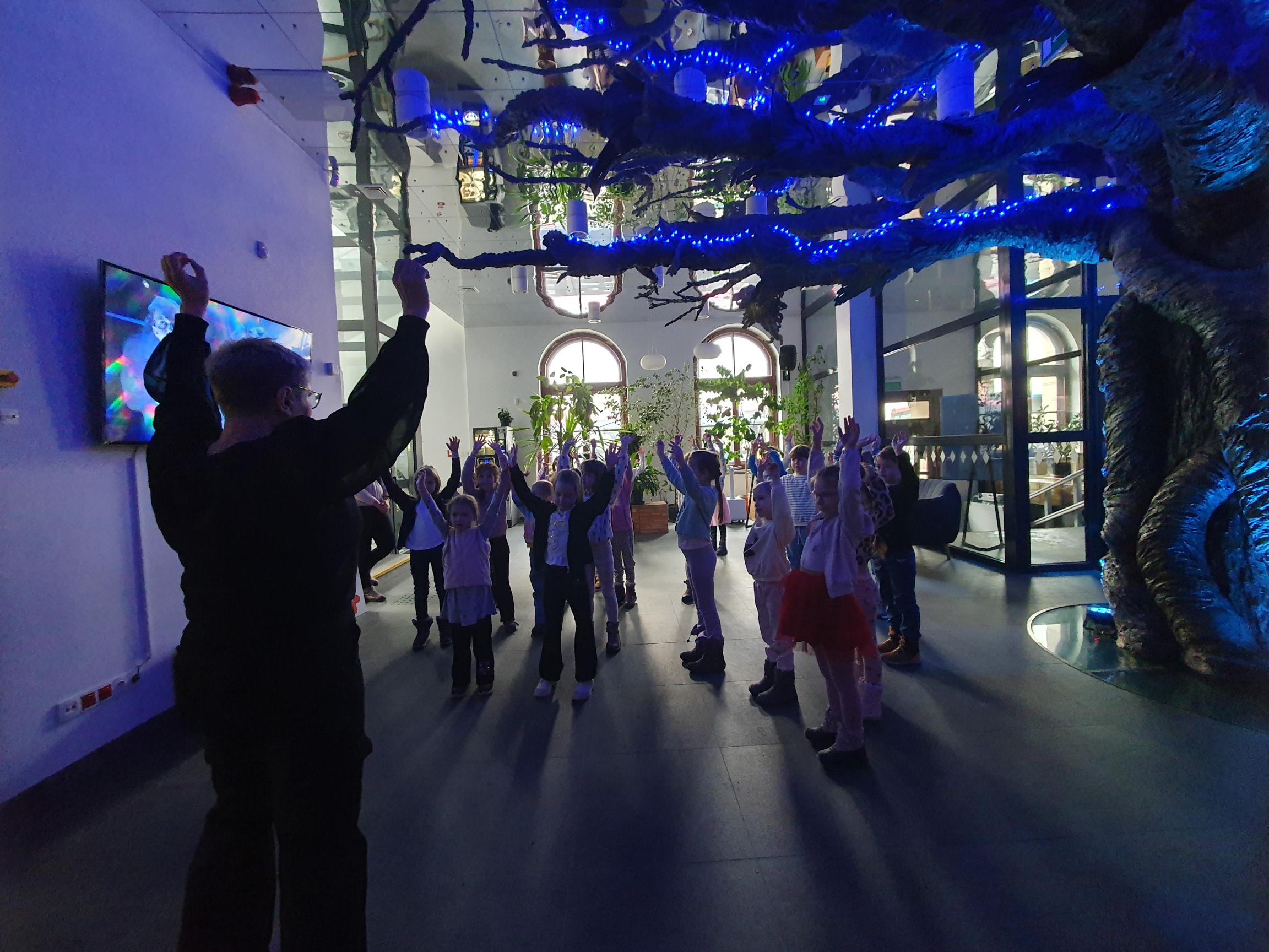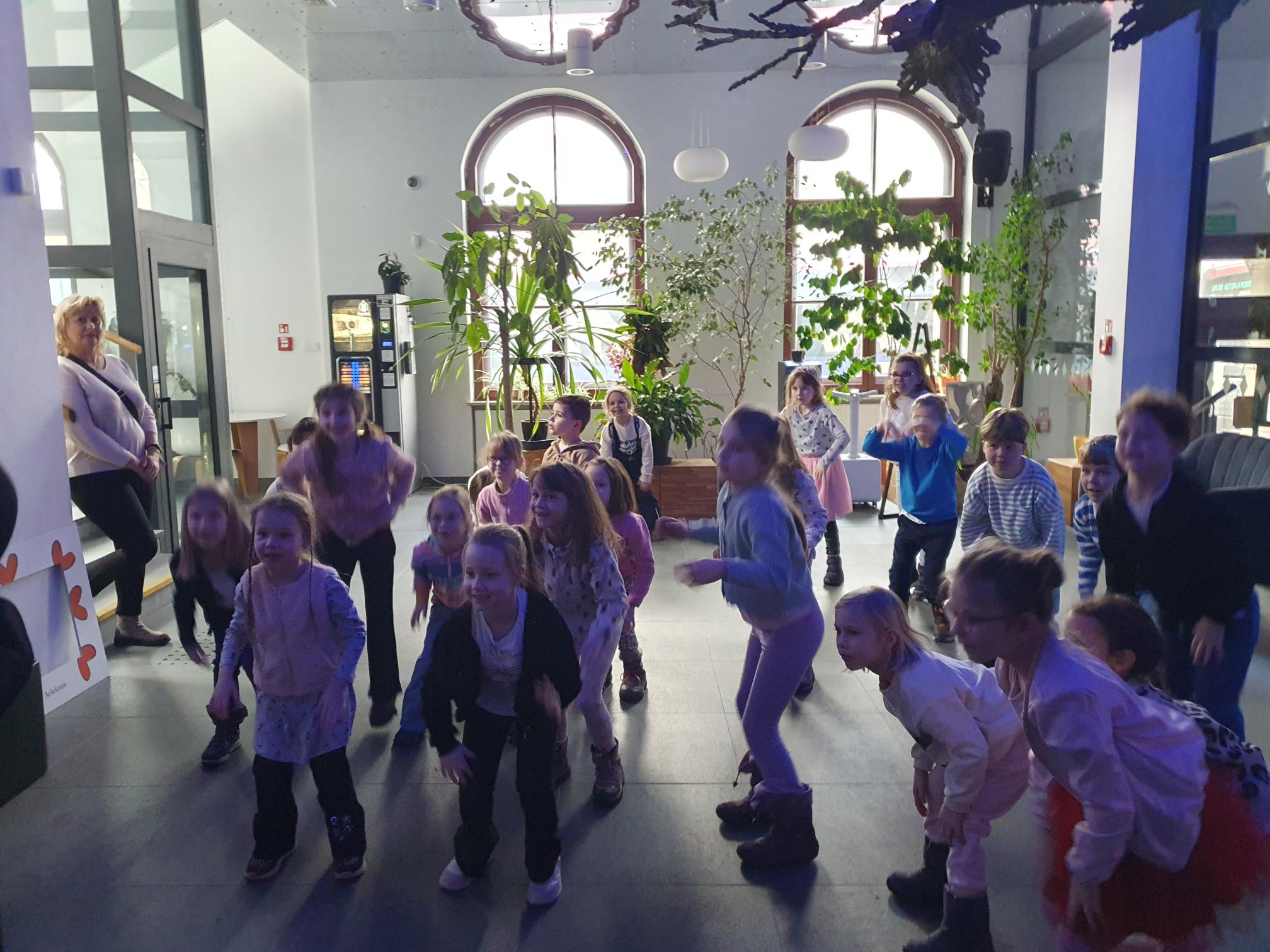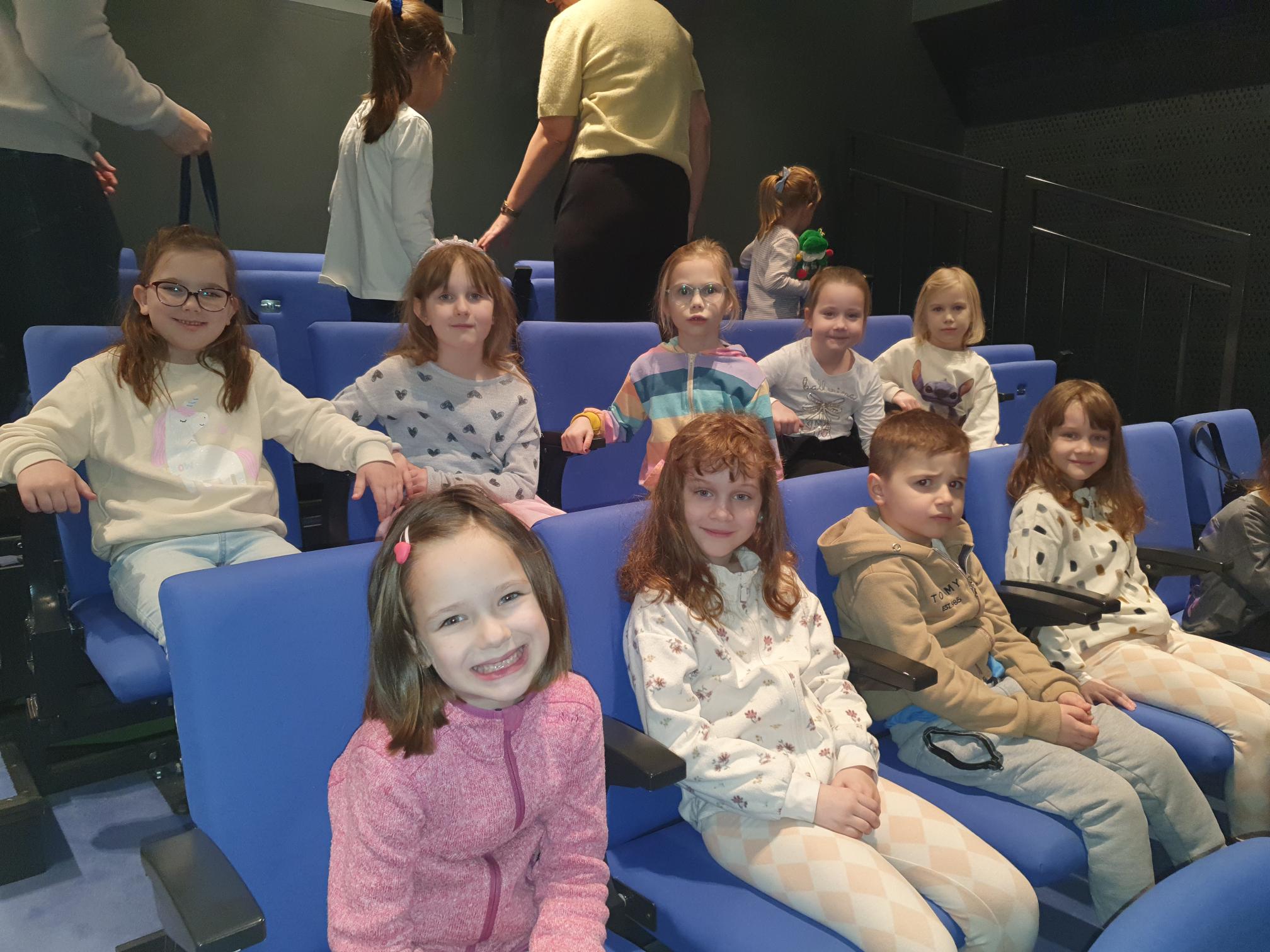 Zanim jednak zasiedliśmy na widowni, zadbaliśmy o odpowiednie przygotowanie – wykonaliśmy krótką rozgrzewkę ruchową, aby łatwiej było nam później spokojnie i uważnie wysiedzieć podczas przedstawienia.