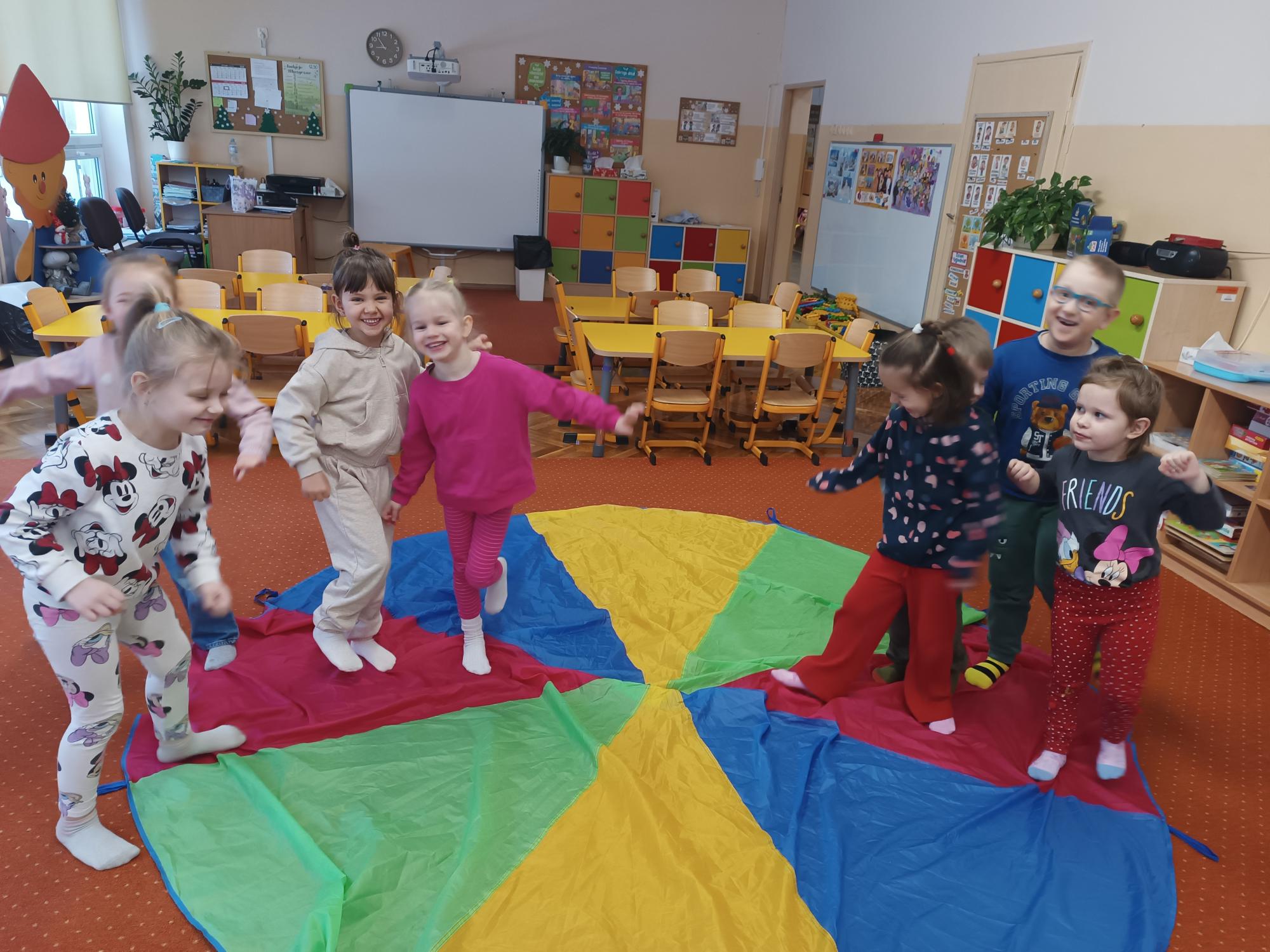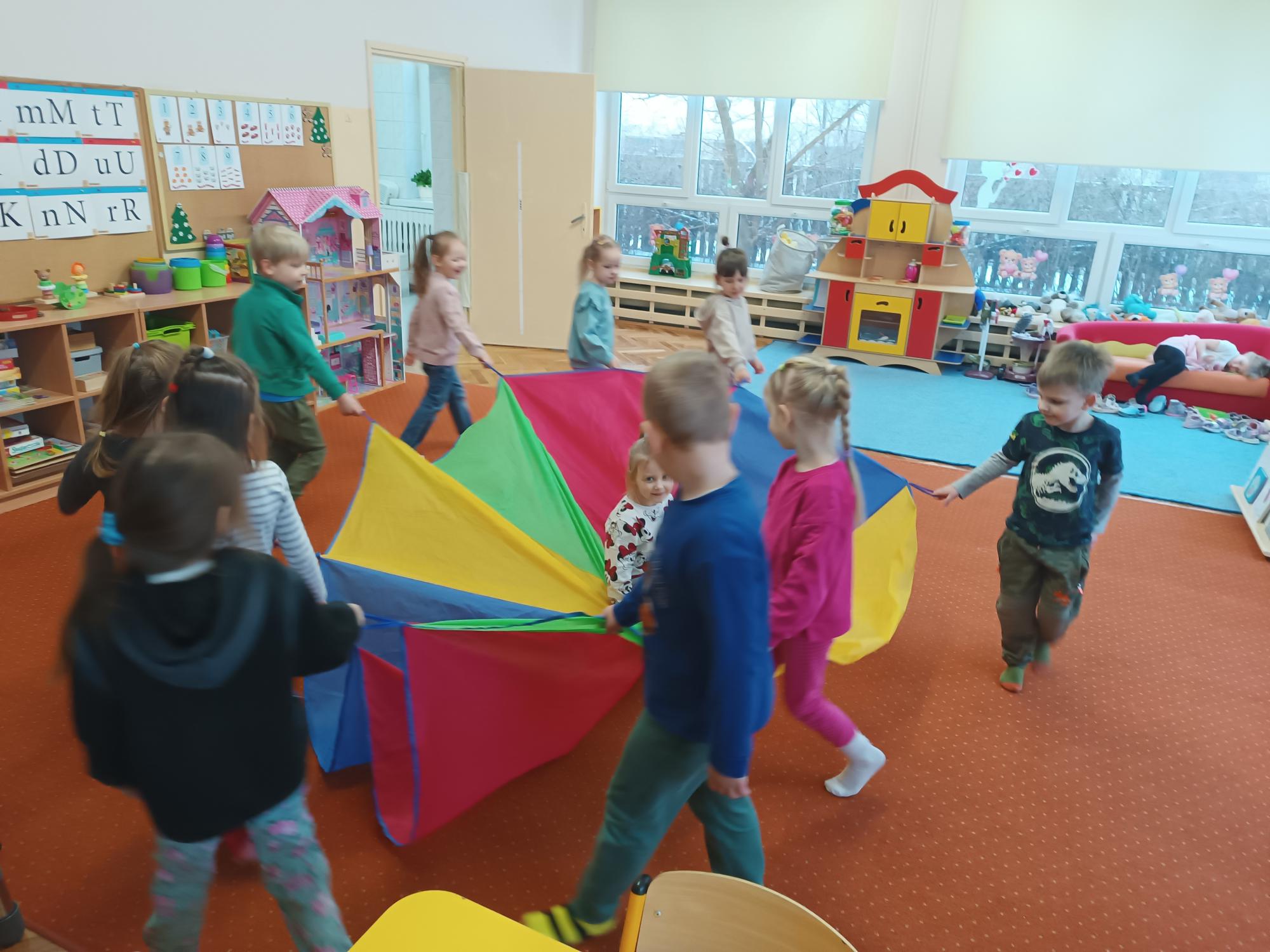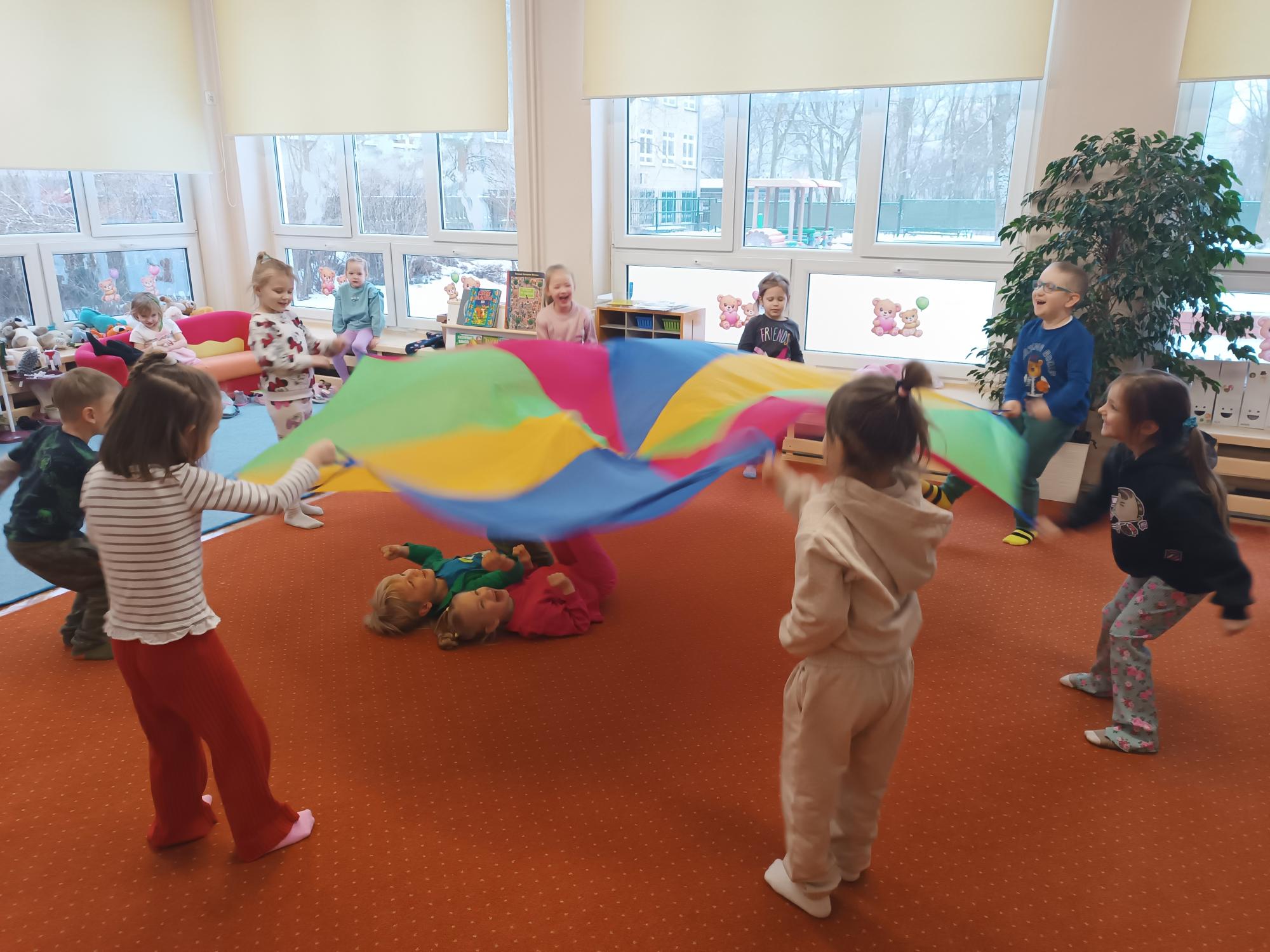 Podczas zajęć dzieci świetnie bawiły się z wykorzystaniem chusty animacyjnej. Wspólne zabawy dostarczyły im dużo radości, sprzyjały integracji grupy oraz rozwijały koordynację ruchową i umiejętność współpracy. Dodatkowo utrwalaliśmy orientację w schemacie ciała – stronę prawą i lewą – oraz pojęcia przestrzenne: niżej–wyżej, a także siłę ruchu: mocno–lekko. Kolorowa chusta i różnorodne aktywności wywołały wiele uśmiechów i pozytywnej energii.