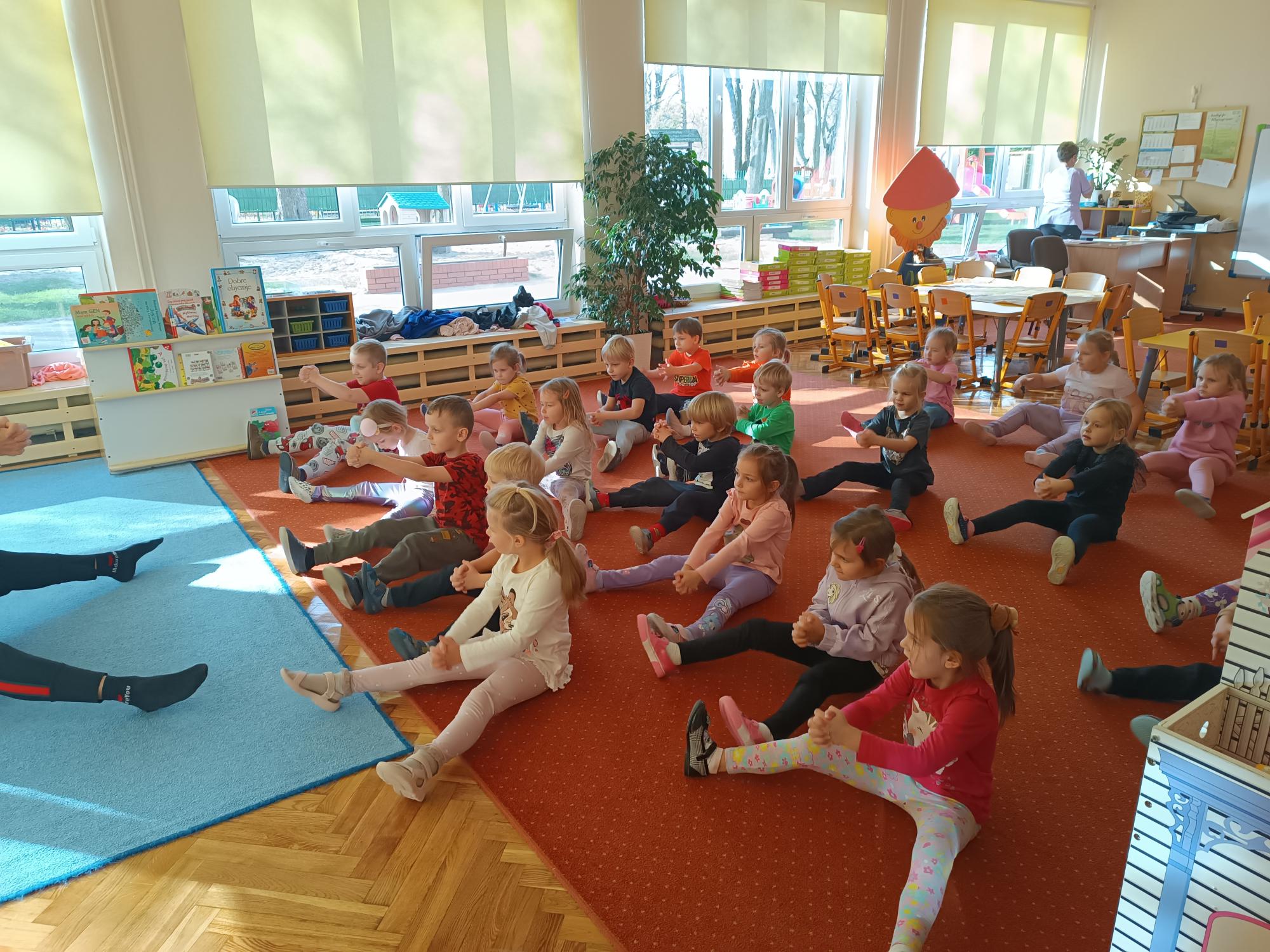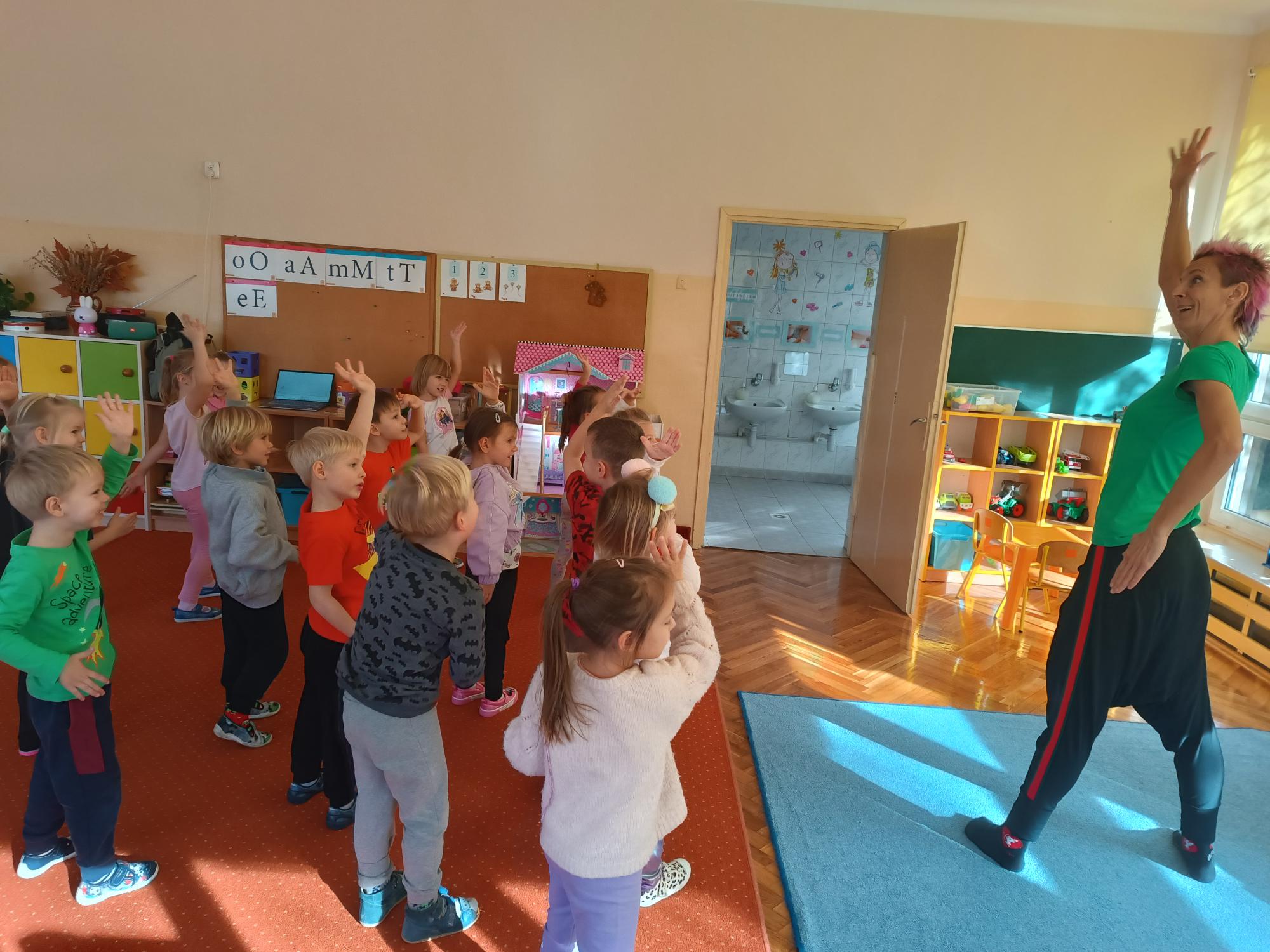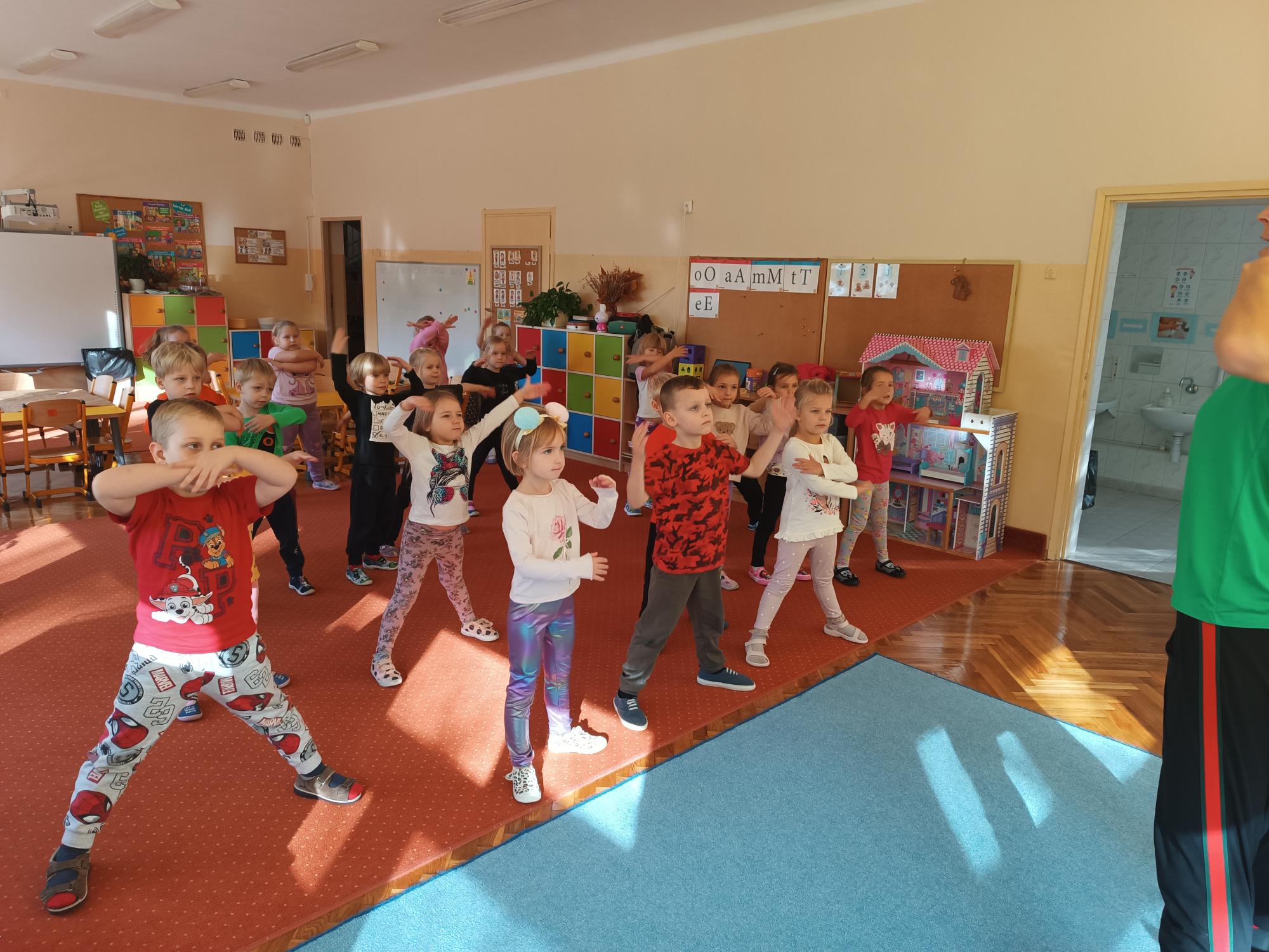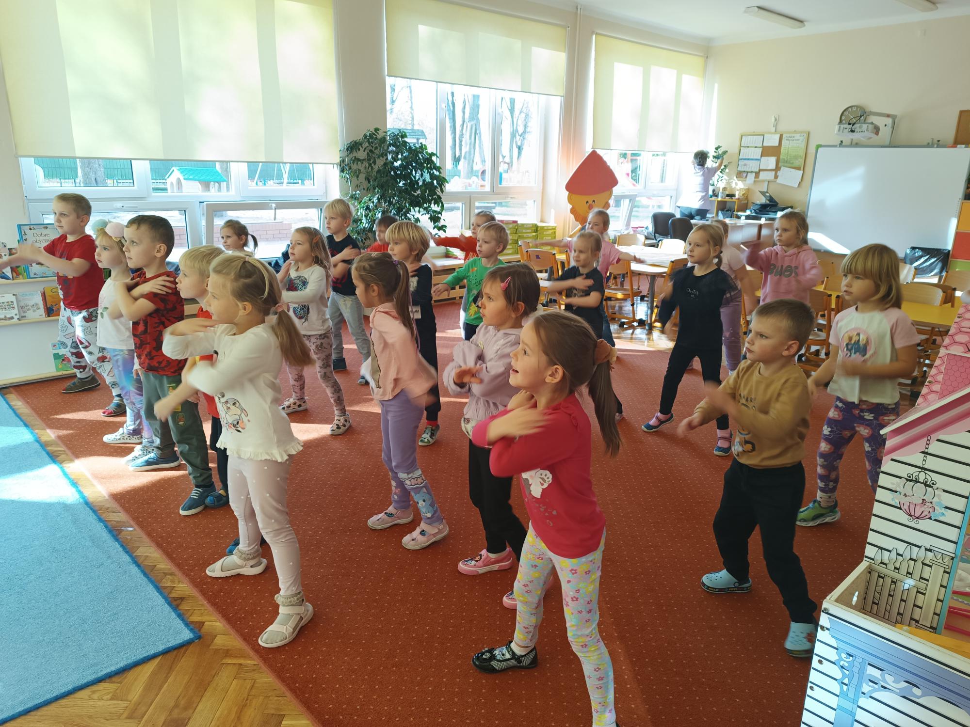 Dzieci uczestniczyły w radosnych i energicznych zajęciach z zumby. Przy wesołej muzyce wykonywały proste układy taneczno - ruchowe. Zumba była dla dzieci nie tylko formą aktywności ruchowej, ale także doskonałą okazją do wyrażania emocji, integracji i czerpania radości ze wspólnej zabawy.